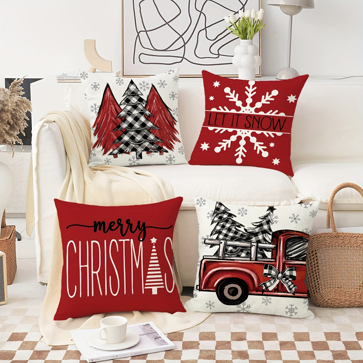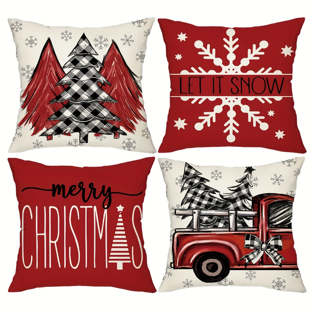 4pcs Red Christmas Pillow Covers, 18*18Inch Set Of 4 Farmhouse Christmas Decorations, Merry Christmas Tree Truck Hello Winter Holiday Decor Throw Cushion Cases For Couch Sofa Living Room Outdoor,Without Pillow Inserts