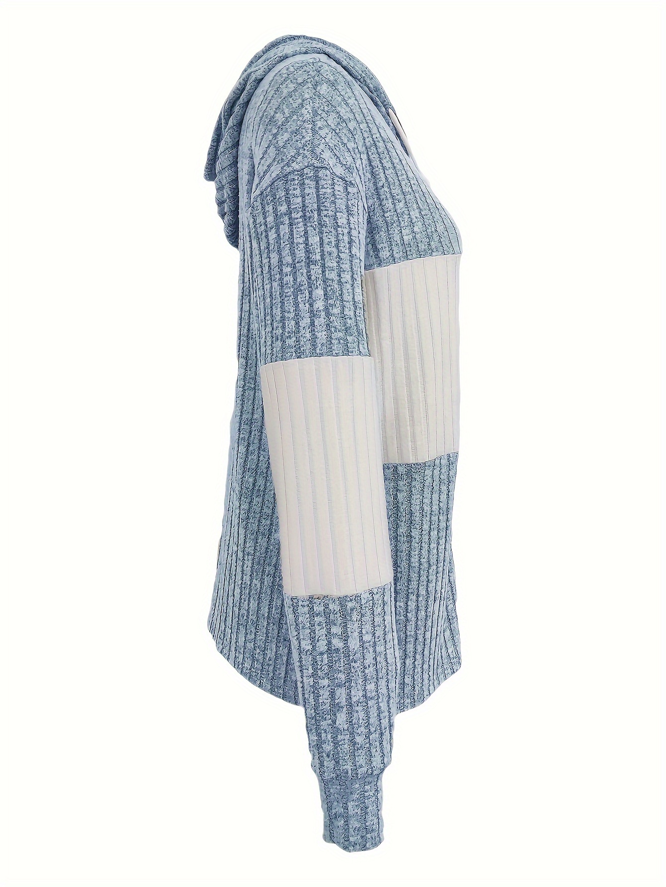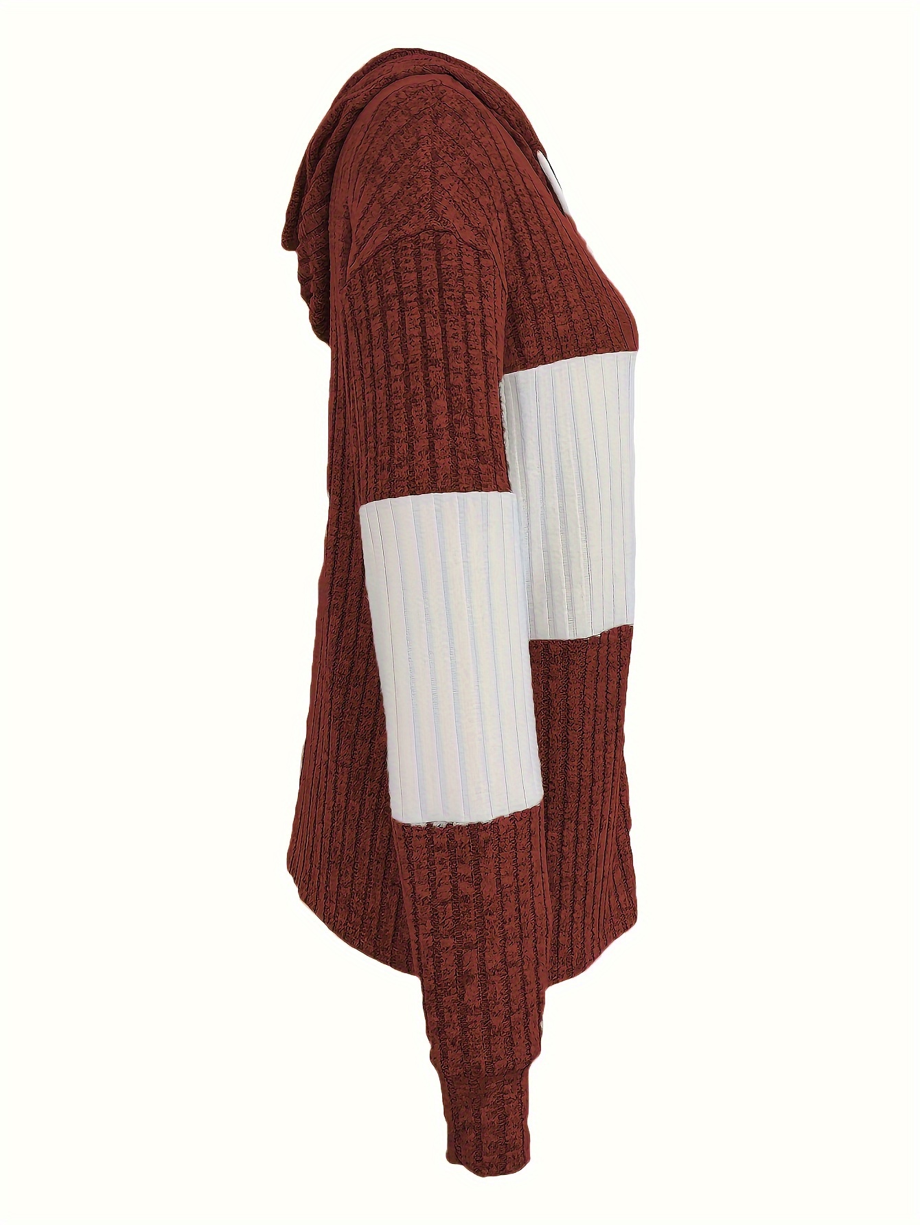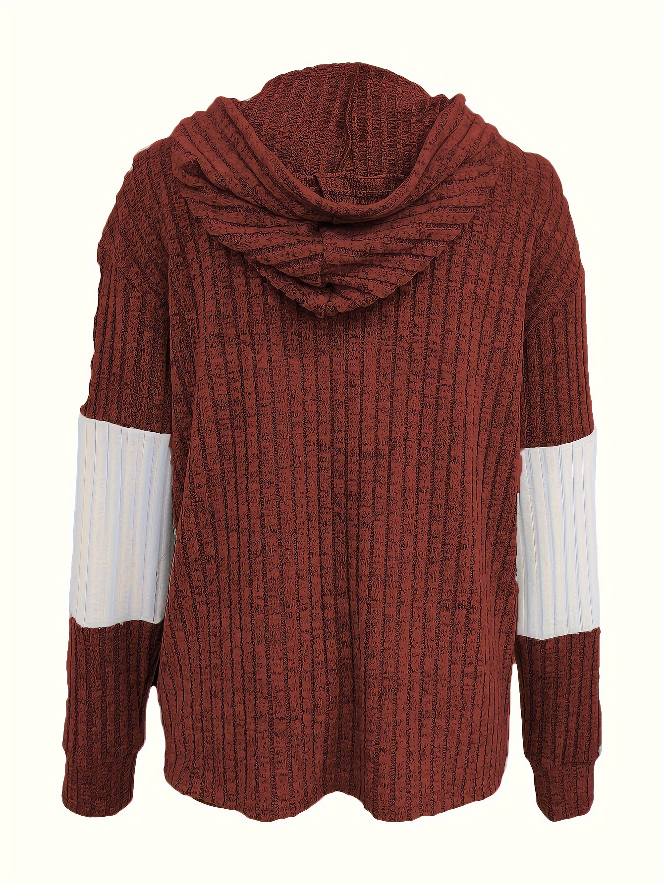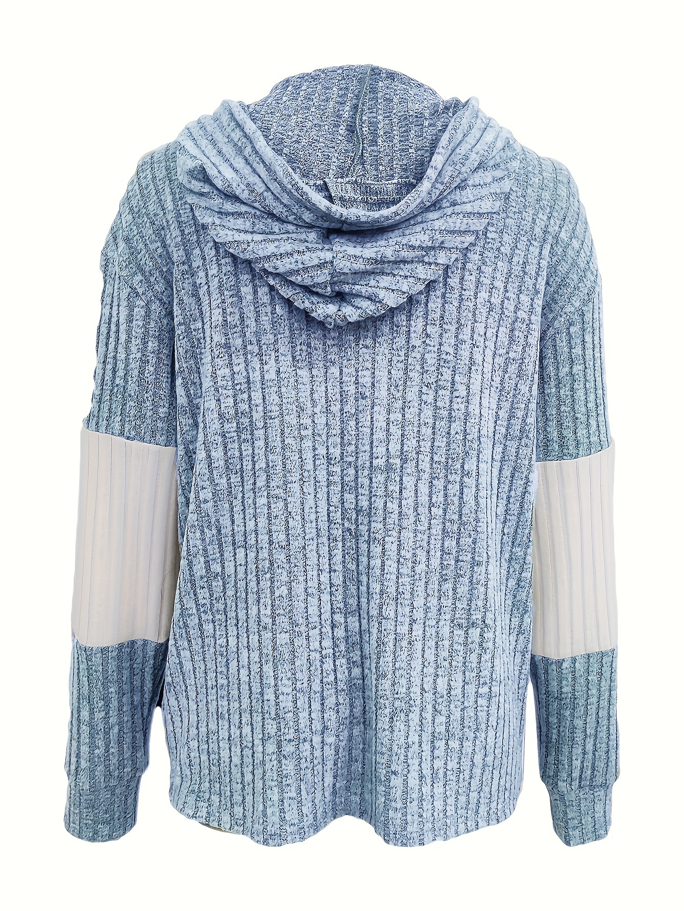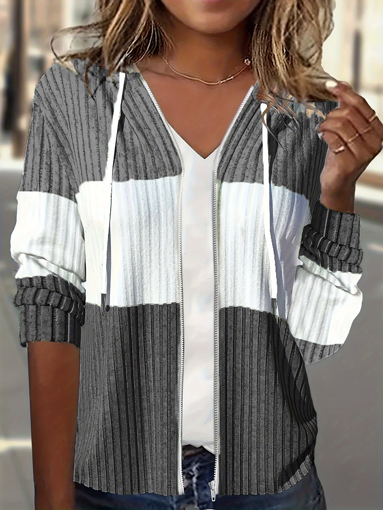 Color Block Zip Up Drawstring Hoodie, Casual Long Sleeve Rib Knit Sweatshirt, Women's Clothing