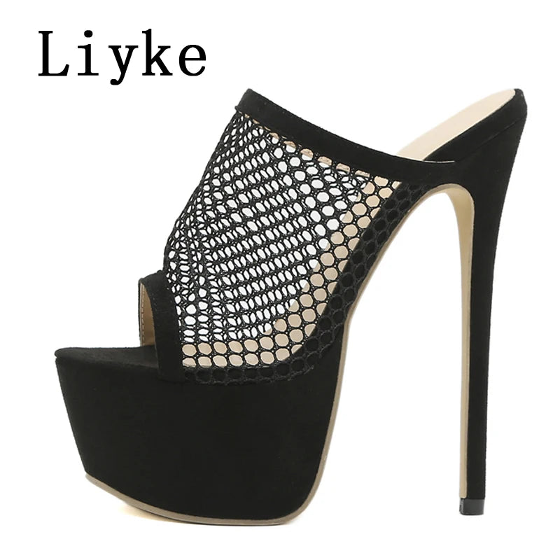 Liyke Size 35-42 Platform Slippers For Women Fashion Breathable Mesh Peep Toe Extreme High Heels Sandals Summer Shoes Lady Pumps
