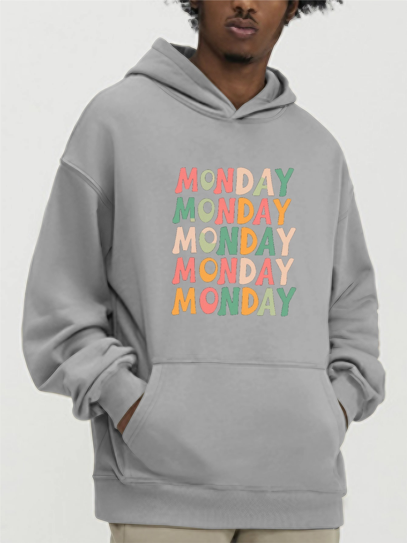 Men's Letter MONDAY Print Hoodie, Casual Loose Hooded Long Sleeve Slightly Stretch Top, Men's Clothings For Outdoor