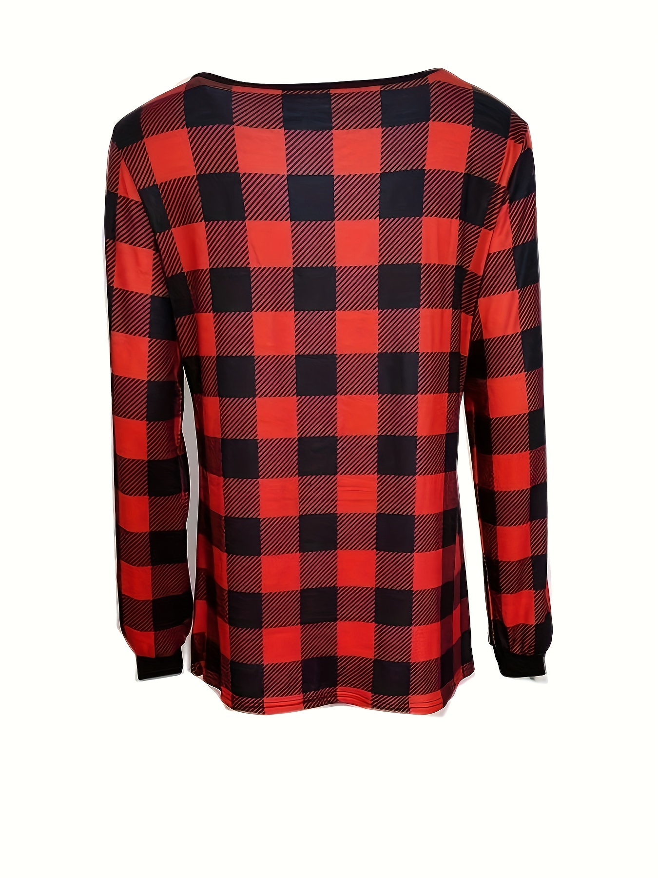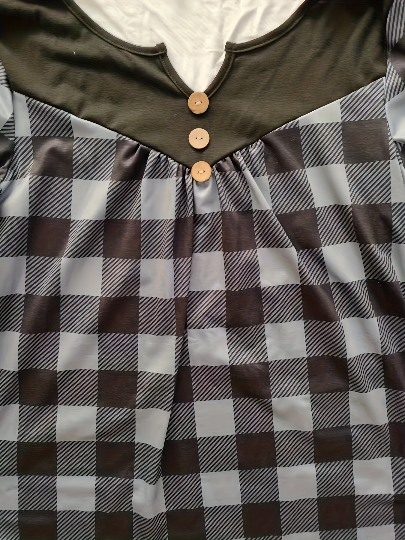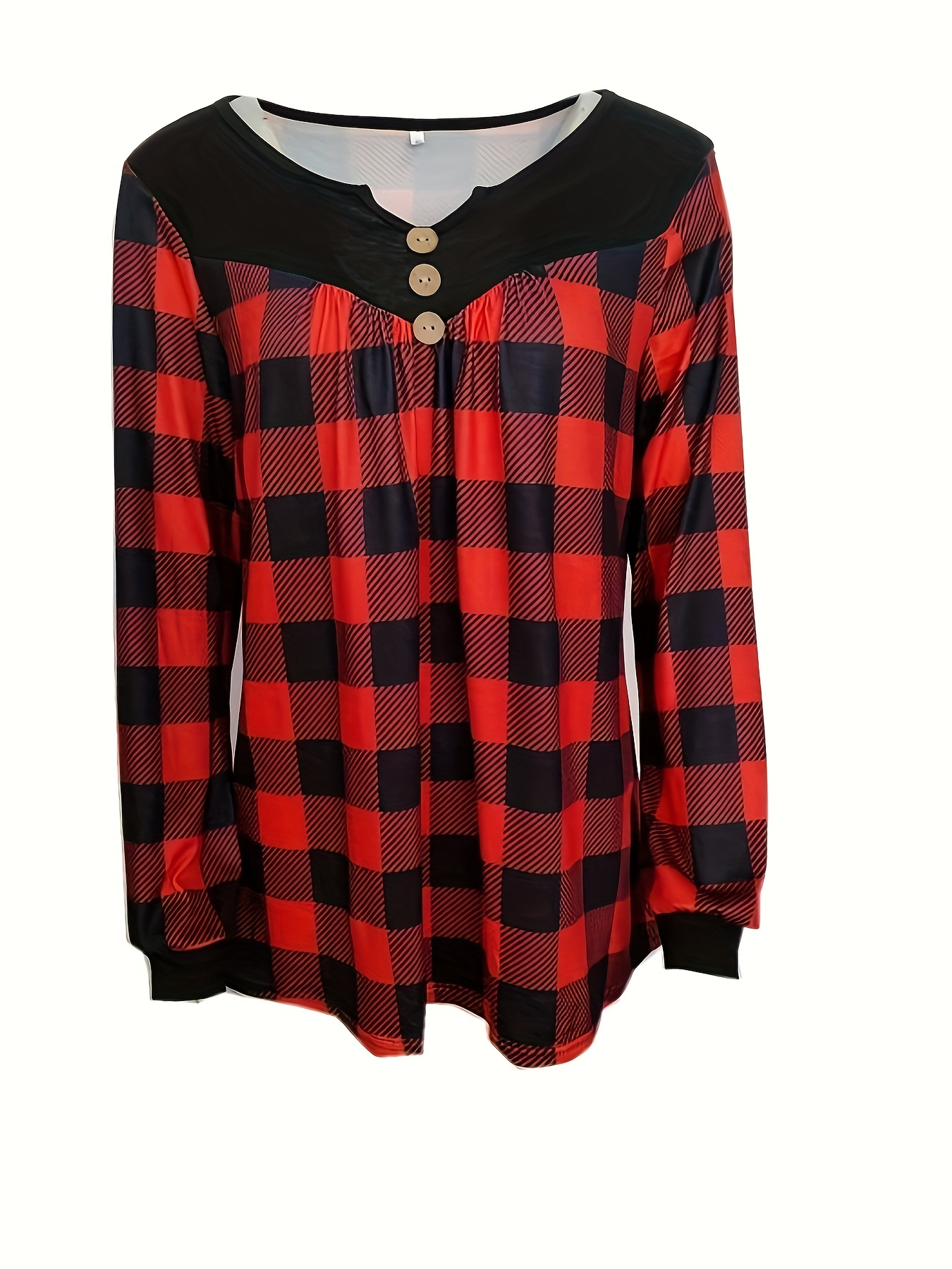 Plaid Print Notch Neck Button T-Shirt, Casual Long Sleeve T-Shirt For Spring & Fall, Women's Clothing