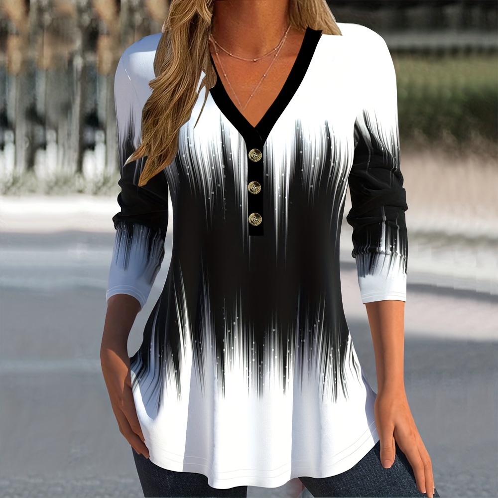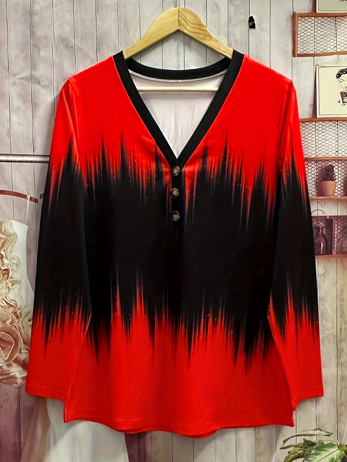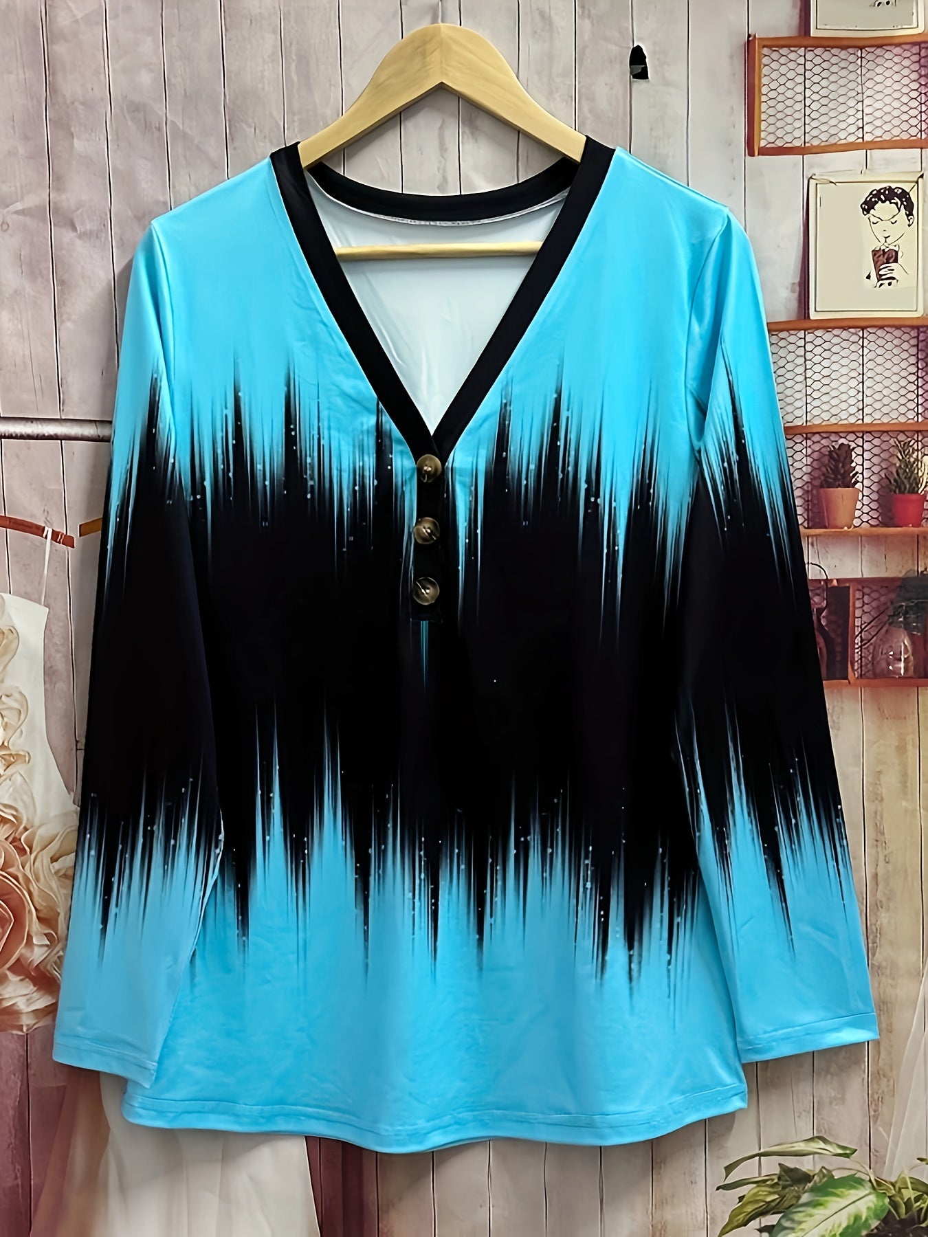 Plus Size Casual T-shirt, Women's Plus Ombre Stripe Print Button Decor Long Sleeve V Neck Slight Stretch T-shirt