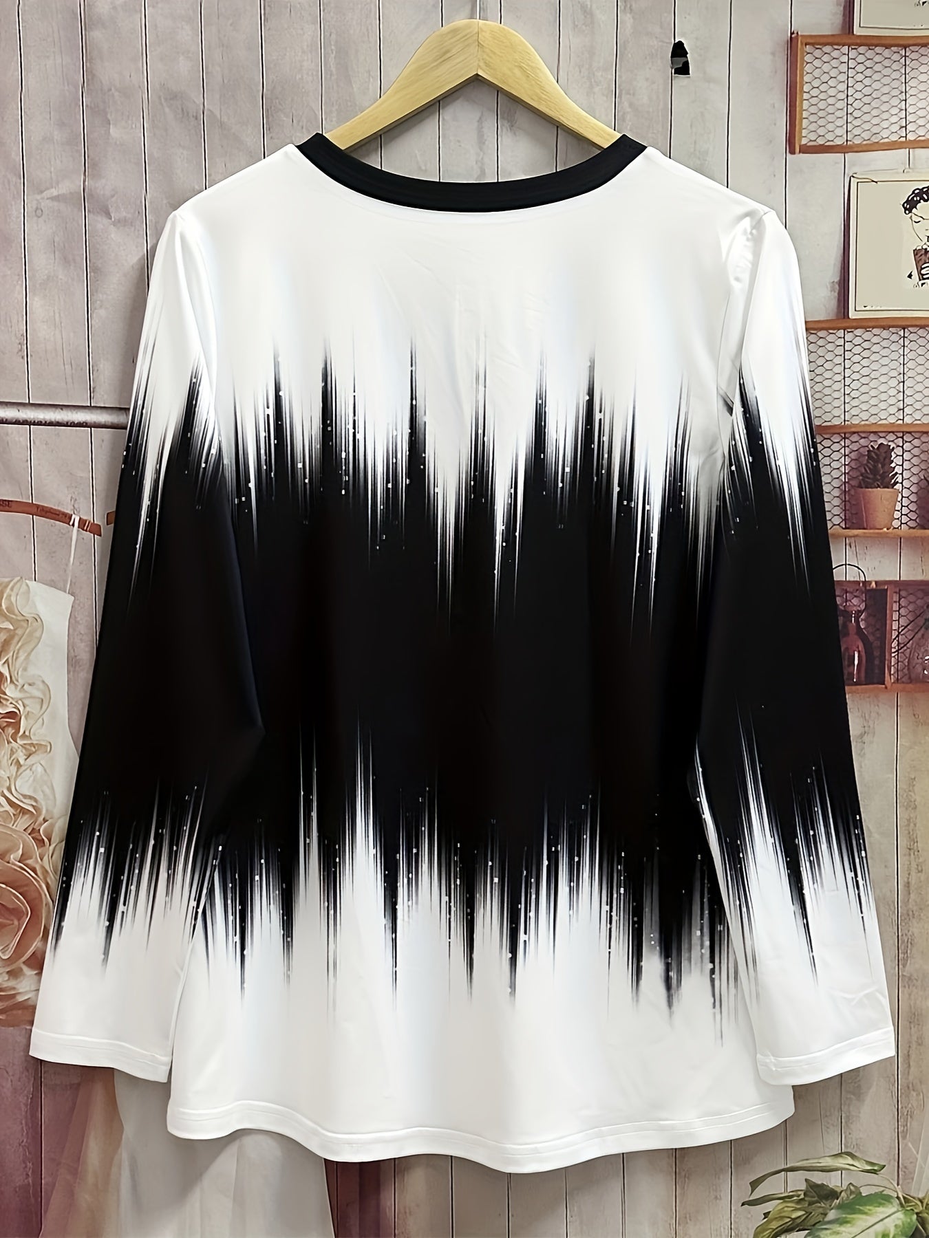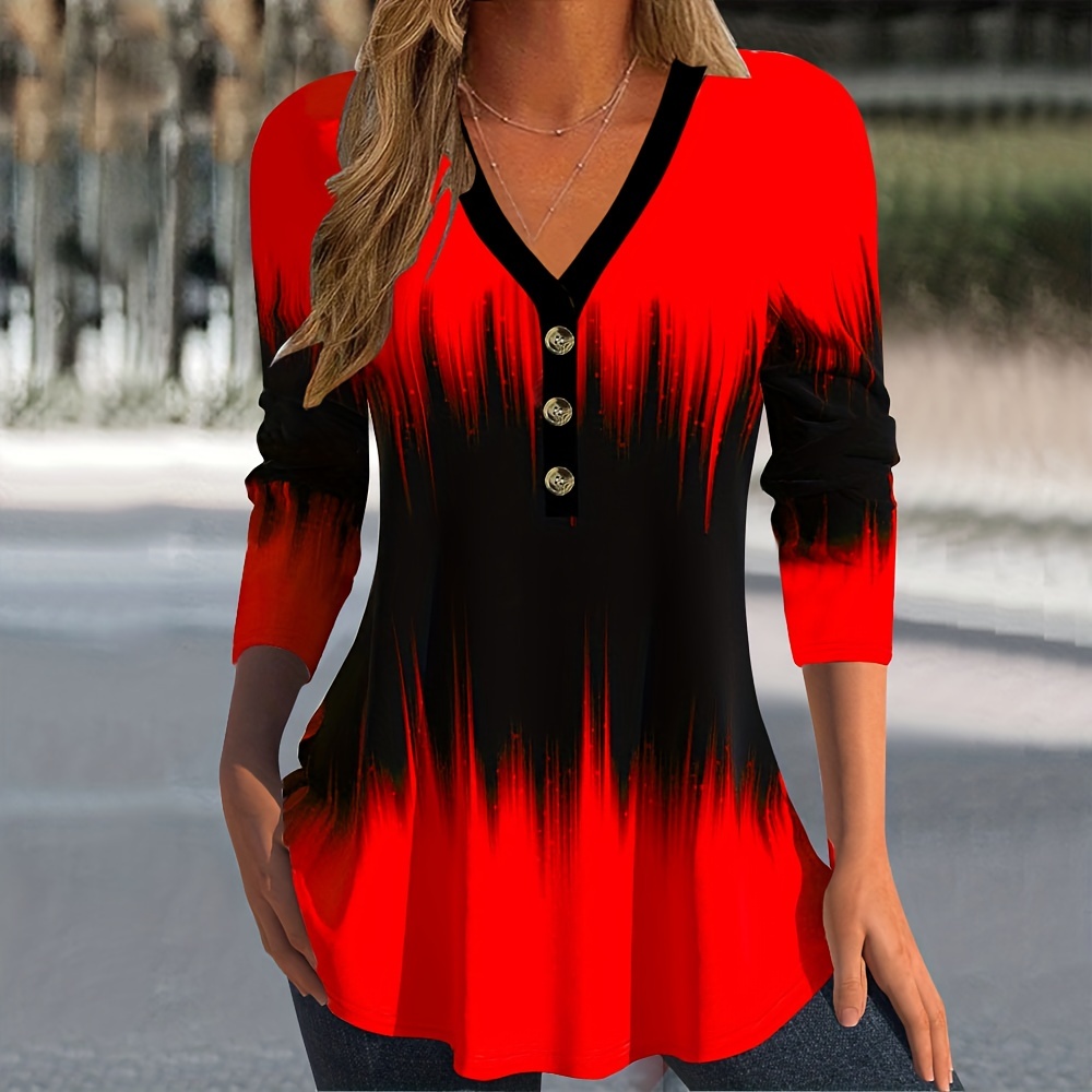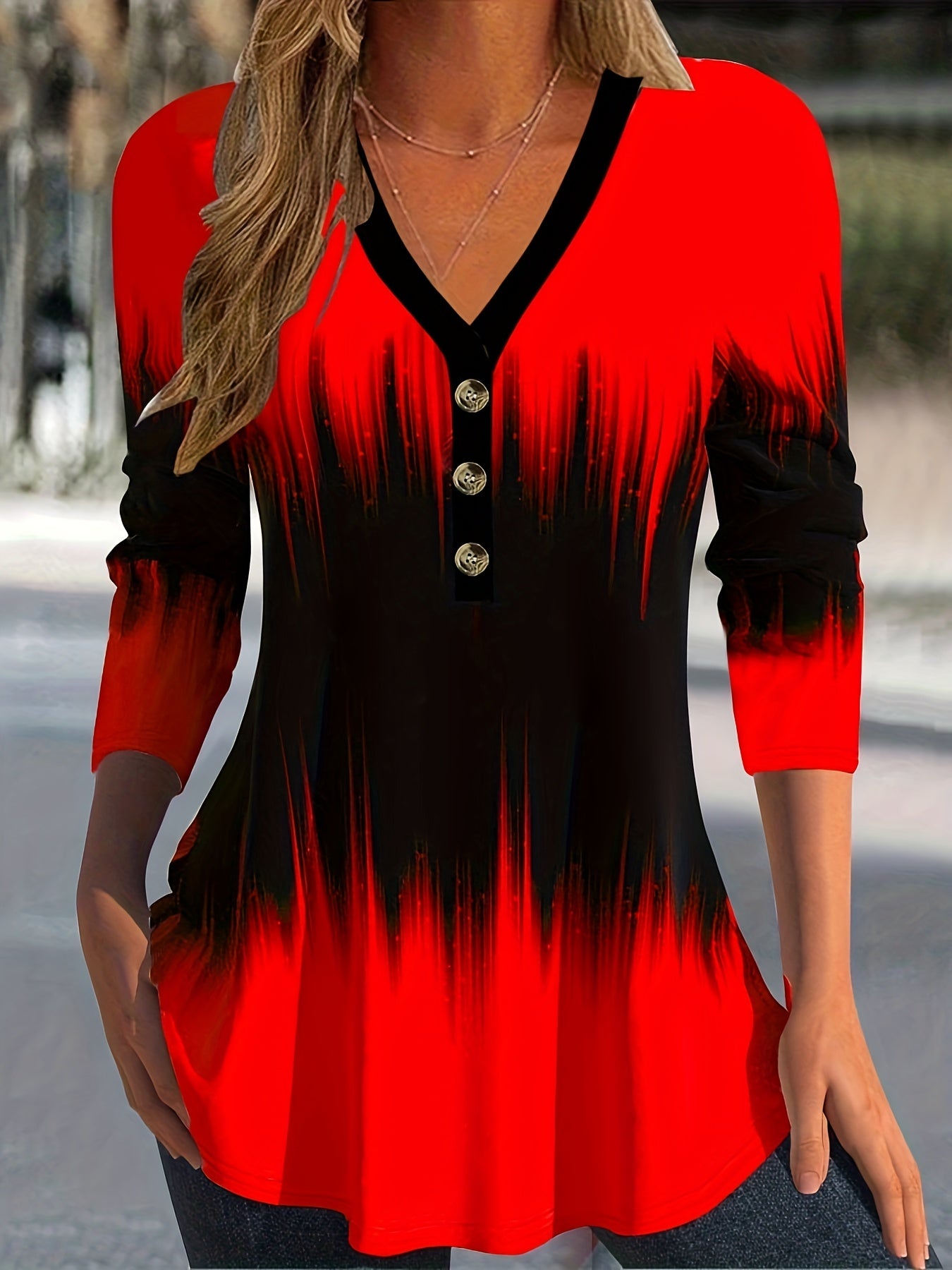 Plus Size Casual T-shirt, Women's Plus Ombre Stripe Print Button Decor Long Sleeve V Neck Slight Stretch T-shirt