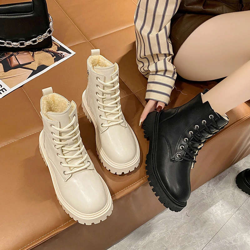 Winter Thicken Plush Ankle Boots Women 2023 New Warm Pu Leather Snow Boots Woman Black Winter Lace-Up Flat Heels Cotton Shoes