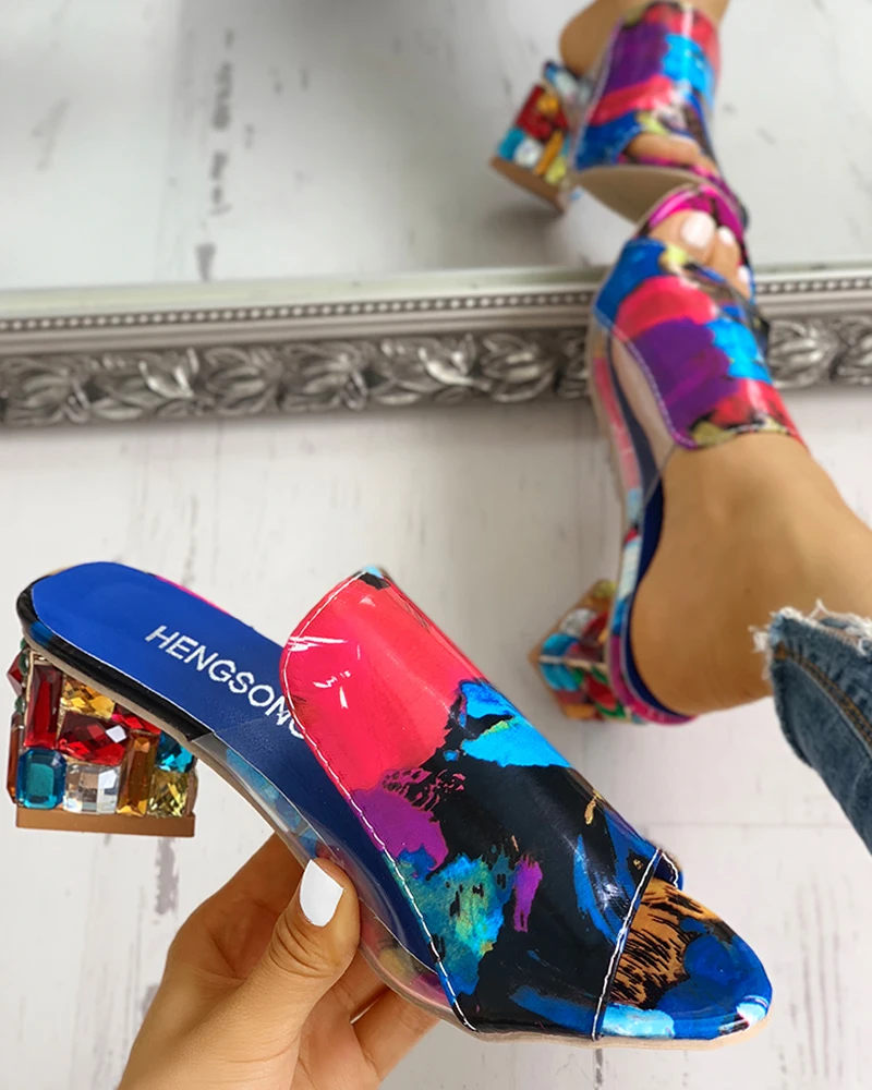 Women Fashion Casual Shoes Low Heel Sandals Colorblock Croc Embossed Rhinestone Chunky Heels