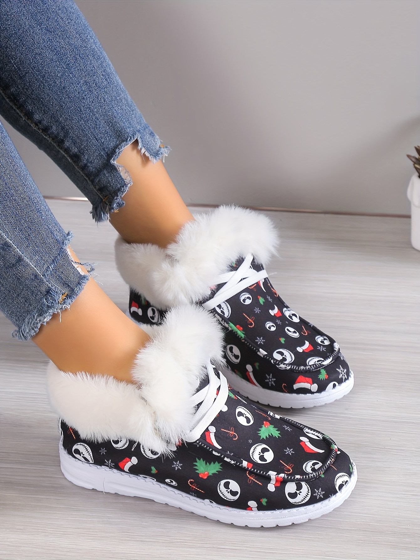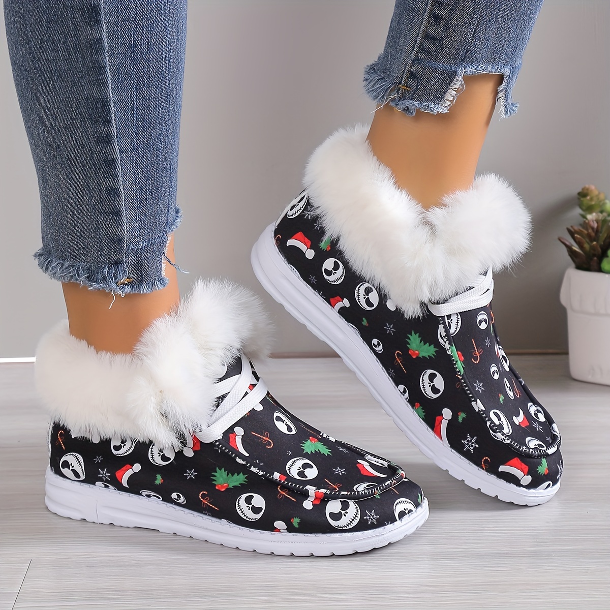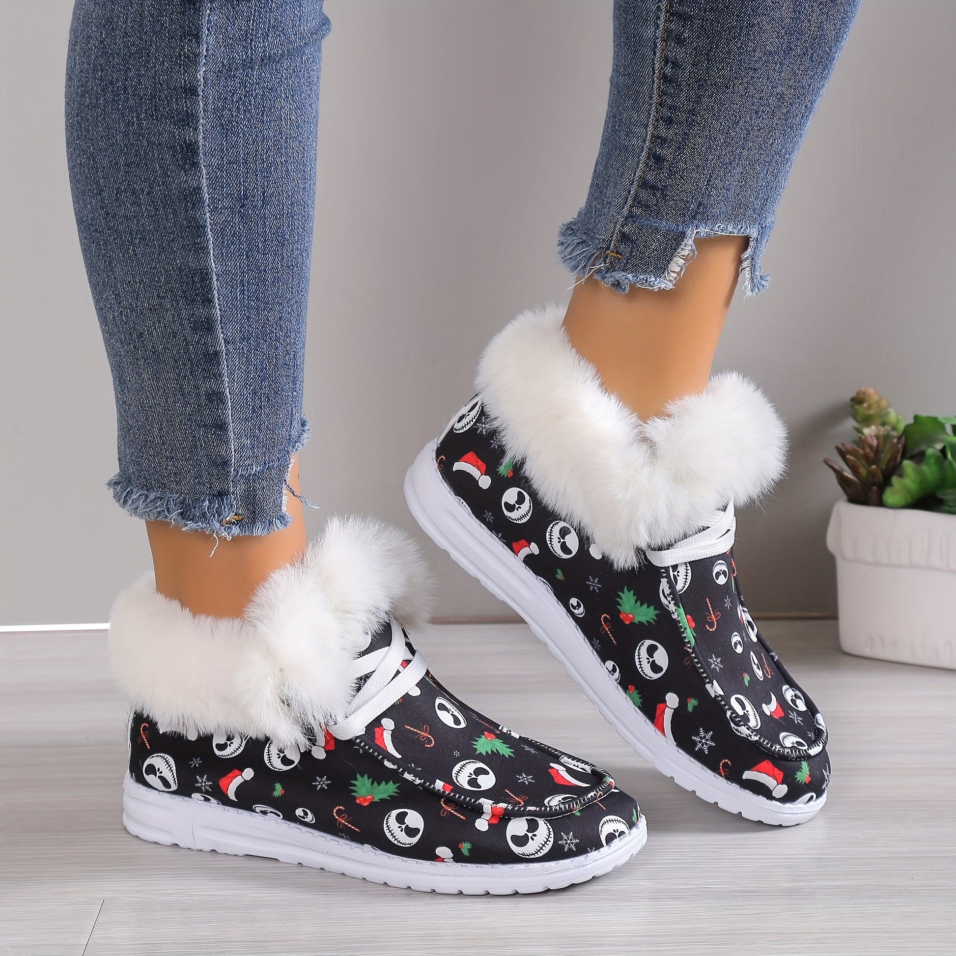 Women's Cartoon Print Fluffy Shoes, Slip On Fleece Lining Flat Soft Sole Shoes, Winter Plush Christmas Canvas Shoes