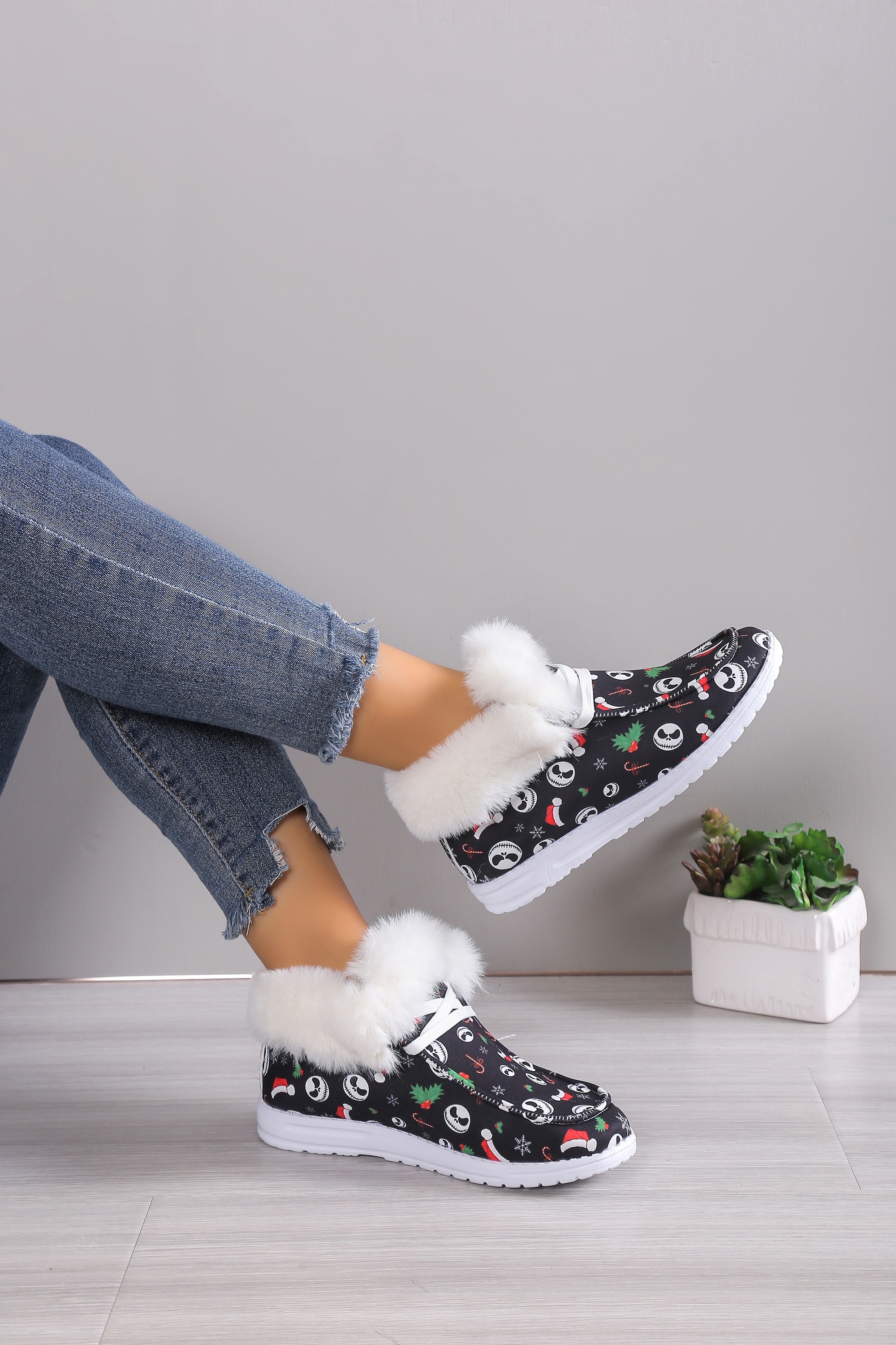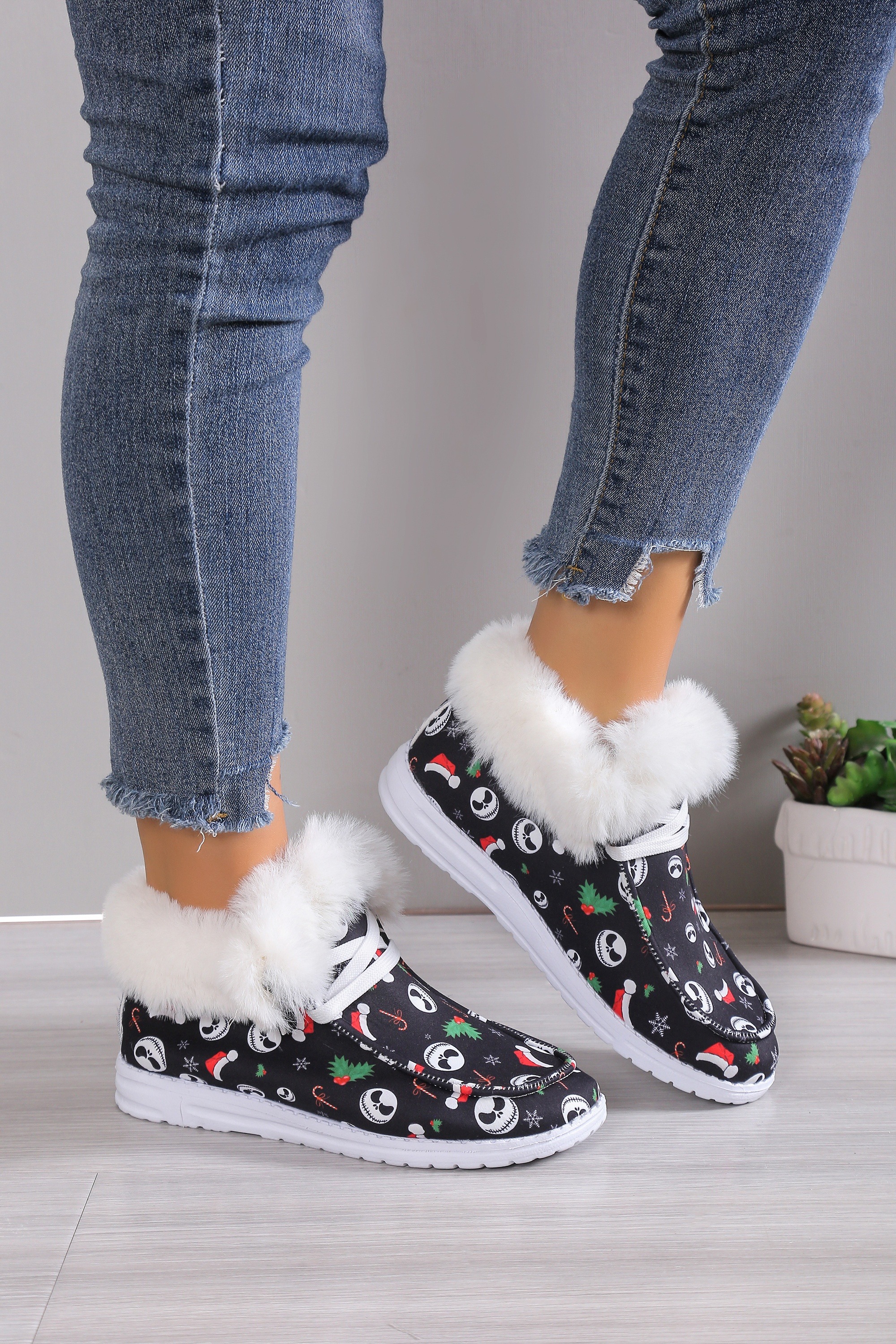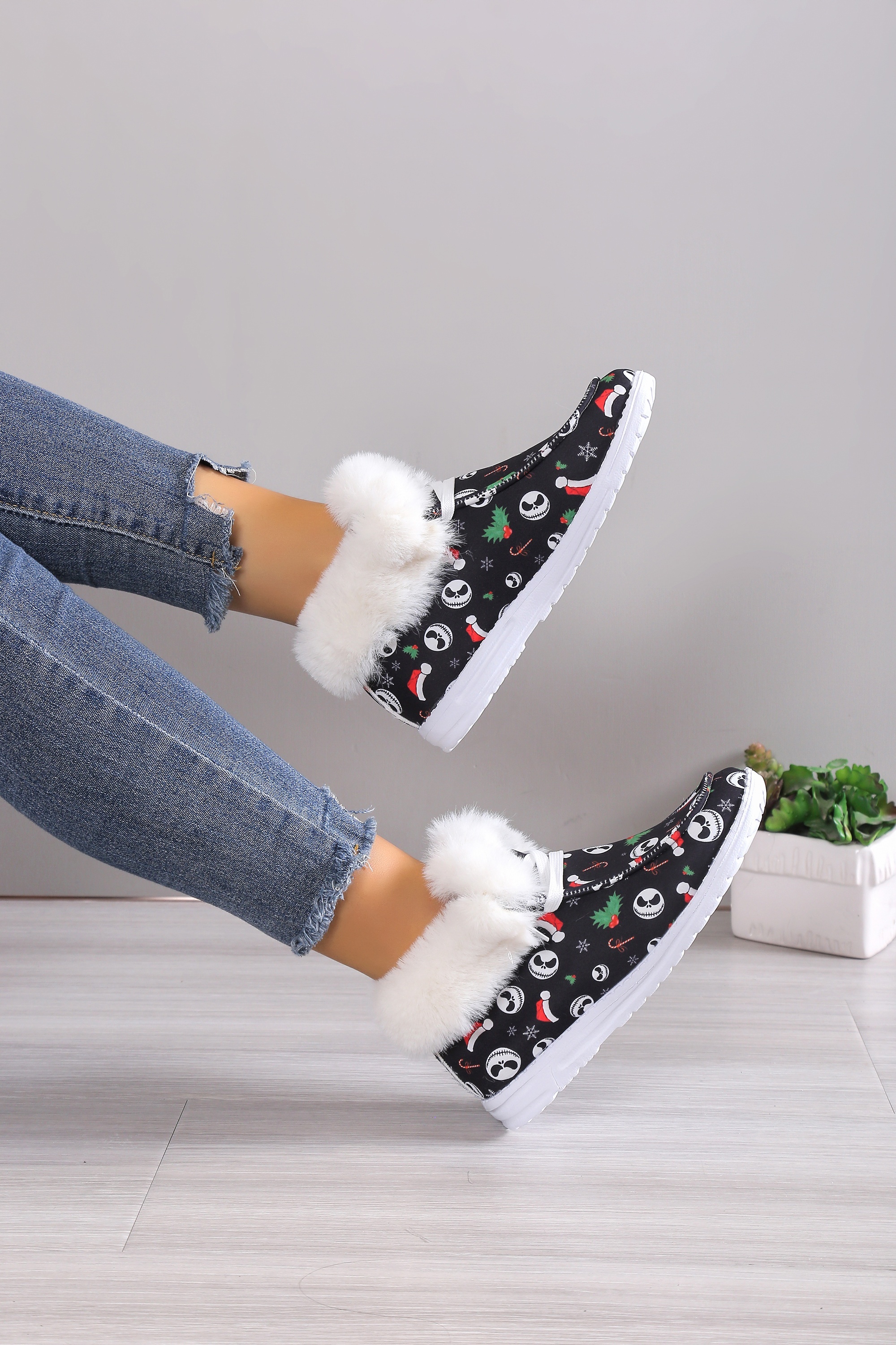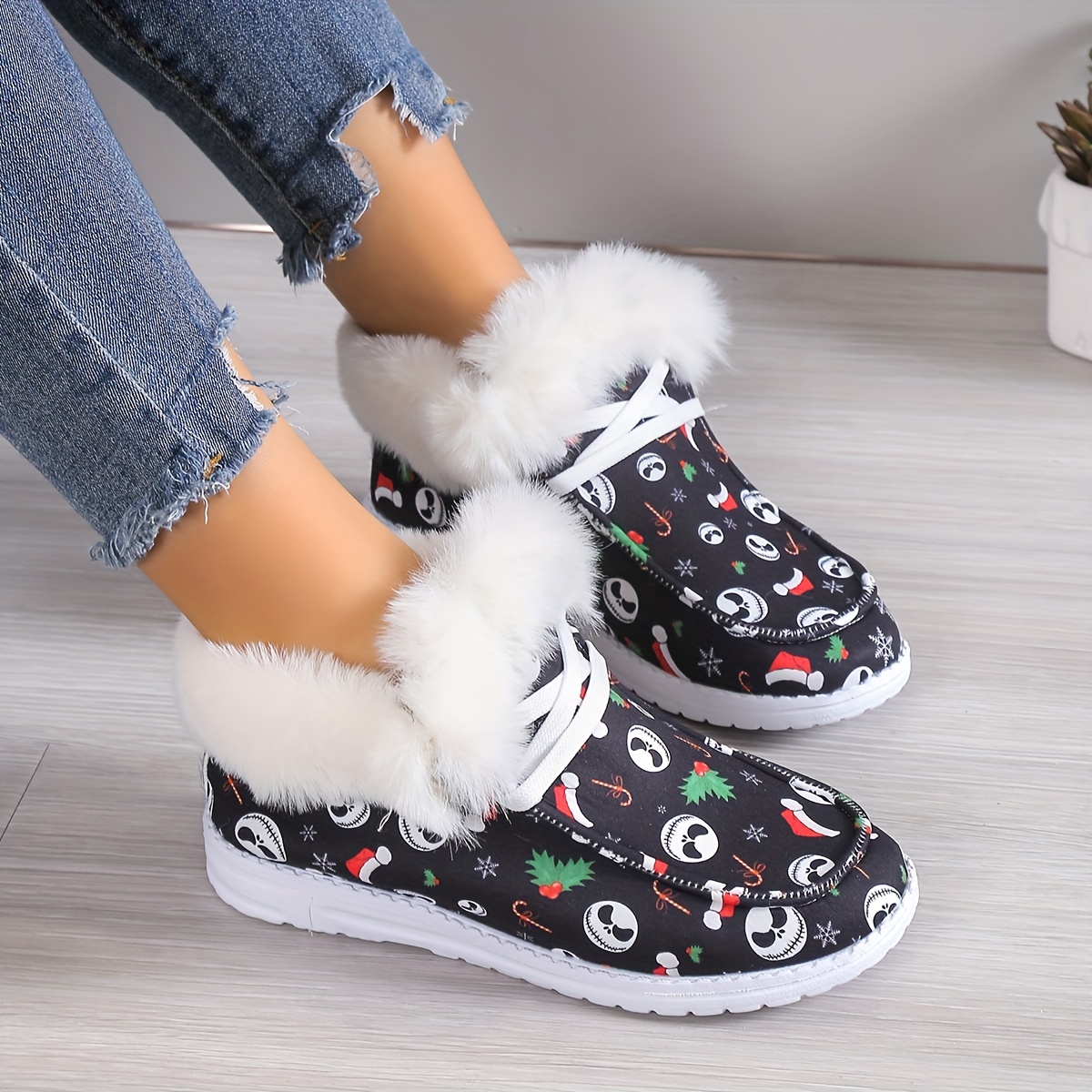 Women's Cartoon Print Fluffy Shoes, Slip On Fleece Lining Flat Soft Sole Shoes, Winter Plush Christmas Canvas Shoes